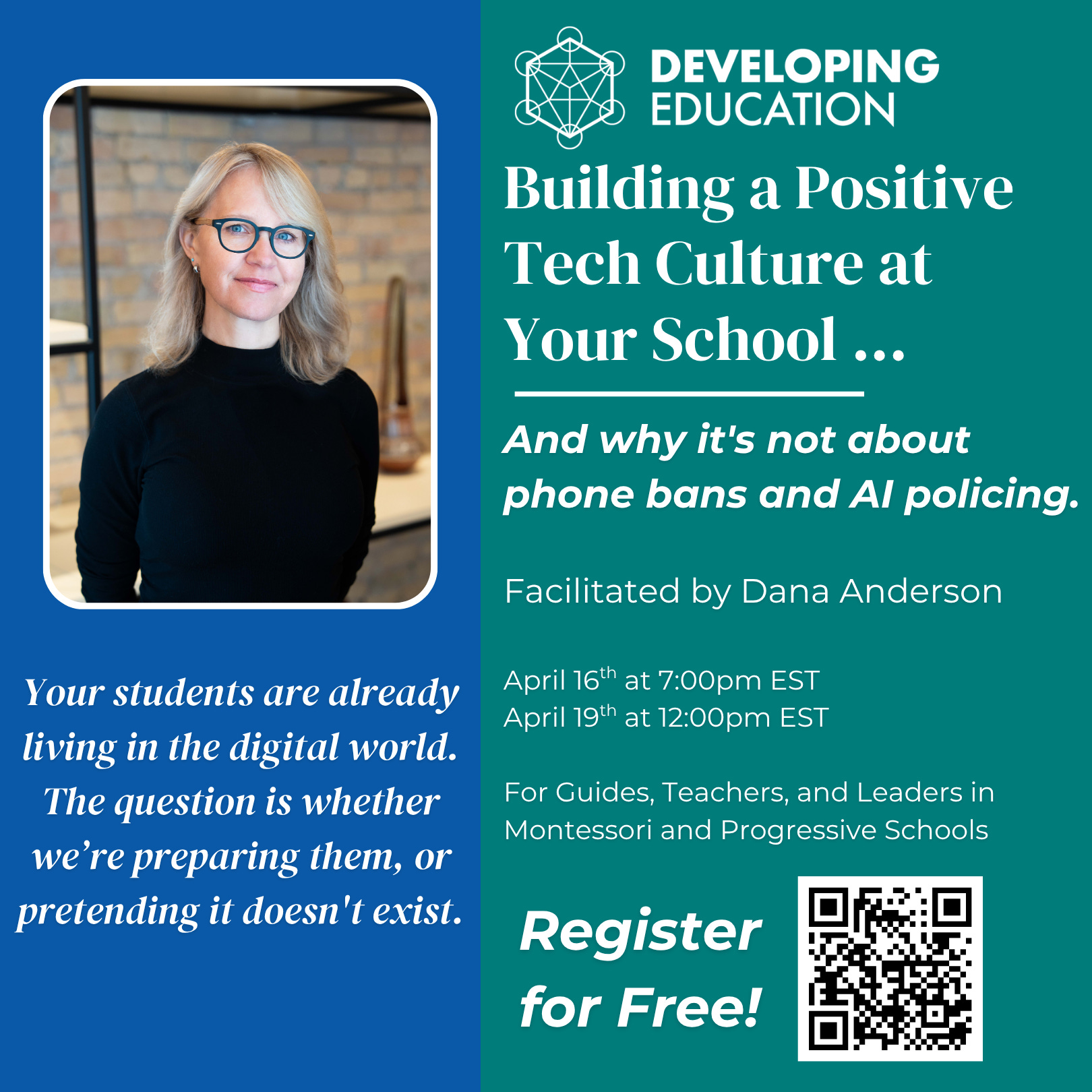 Dana Anderson is facilitating a free webinar with Developing Education: Building a Positive Tech Culture at Your School... And Why It’s Not About Phone Bans and AI Policing. If you caught our podcast conversation, you already know that Dana brings something rare to this space; she’s deeply rooted in Montessori philosophy, she’s a digital citizenship expert who has worked with Common Sense Media, and she refuses to separate technology from the bigger questions of human development and peace education. And she has real, practical tools to help you use technology as a tool for human development.